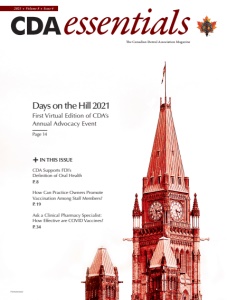 PM40064661 2021 • Volume 8 • Issue 4 Days on theHill 2021 First Virtual Edition of CDA’s Annual Advocacy Event Page 14 + IN THIS ISSUE CDA Supports FDI’s Definition of Oral Health P. 8 How Can Practice Owners Promote Vaccination Among Staff Members? P. 19 Ask a Clinical Pharmacy Specialist: How Effective are COVID Vaccines? P. 34