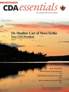 CDABoardofDirectors President Dr. Heather Carr Dr. Lesli Hapak Ontario CDAMissionStatement The Canadian Dental Association (CDA) is the national voice for dentistry dedicated to the promotion of optimal oral health, an essential component of general health, and to the advancement and leadership of a unified profession. is the official print publication of CDA, providing dialogue between the national association and the dental community. It is dedicated to keeping dentists informed about news, issues and clinically relevant information. Dr. Brian Baker Saskatchewan President-Elect Dr. Joel Antel Vice-President Dr. Bruce Ward Dr. Mark Bochinski Alberta Dr. Dana Coles Prince Edward Island Dr. Viktor Dorokhine NWT/Nunavut/Yukon Dr. Raymon Grewal British Columbia Dr. Kirk Preston New Brunswick Dr. Stuart MacDonald Nova Scotia Dr. Marc Mollot Manitoba Dr. Jason Noel Newfoundland/Labrador 2023 • Volume 10 • Issue 3 Head of Communications Zelda Burt Managing Editor Sean McNamara Writer/Editor Sierra Bellows Gabriel Fulcher Pauline Mérindol Publications & Electronic Media Associate Rachel Galipeau Graphic Designer Carlos Castro Advertising: All matters pertaining to advertising should be directed to: Peter Greenhough Media Partners Inc. 15 Wade Road Ancaster, ON L9G 4G1 Display or web advertising: Peter Greenhough pgreenhough@pgmpi.ca 647-955-0060, ext. 101 Classified advertising: John Reid jreid@pgmpi.ca 647-955-0060, ext. 102 Contact: Rachel Galipeau rgalipeau@cda-adc.ca Call CDA for information and assistance toll-free (Canada) at: 1-800-267-6354 Outside Canada: 613-523-1770 CDA email: publications@cda-adc.ca @CdnDentalAssoc @JCDATweets @CDAOasisLive canadian-dentalassociation CanadianDental Association CDAOasis cdndentalassoc cdaoasis cda-adc.ca CDA Essentials is published by the Canadian Dental Association in both official languages. Publications Mail Agreement no. 40064661. Return undeliverable Canadian addresses to: Canadian Dental Association at 1815 Alta Vista Drive, Ottawa, ON K1G 3Y6. Postage paid at Ottawa, ON. Notice of change of address should be sent to CDA: reception@cda-adc.ca ISSN 2292-7360 (Print) ISSN 2292-7379 (Online) © Canadian Dental Association 2023 Editorial Disclaimer All statements of opinion and supposed fact are published on the authority of the author who submits them and do not necessarily express the views of the Canadian Dental Association (CDA). Publication of an advertisement does not necessarily imply that CDA agrees with or supports the claims therein. The editorial department reserves the right to edit all copy submitted to CDA Essentials. Furthermore, CDA is not responsible for typographical errors, grammatical errors, misspelled words or syntax that is unclear, or for errors in translations. Sponsored content is produced by Peter Greenhough Media Partners Inc., in consultation with its clients. The CDA Essentials editorial department is not involved in its creation. 3 Issue 3 | 2023 |