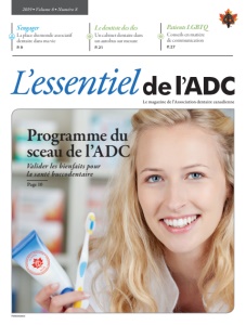 2019 • Volume 6 • Numéro 8 PM40064661 Valider les bienfaits pour la santé buccodentaire Programme du sceau de l’ADC Page 10 Le dentiste des îles Un cabinet dentaire dans un autobus sur mesure P. 21 S’engager La place du monde associatif dentaire dans ma vie P. 9 Patients LGBTQ Conseils en matière de communication P. 27