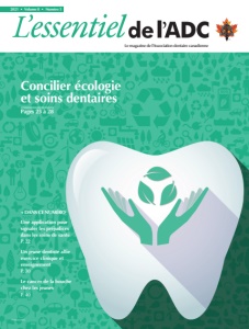 Lemagazine de l’Association dentaire canadienne PM40064661 2021 • Volume 8 • Numéro 5 Concilier écologie et soins dentaires Pages 25 à 28 + DANS CE NUMÉRO Une application pour signaler les préjudices dans les soins de santé P. 22 Un jeune dentiste allie exercice clinique et enseignement P. 30 Le cancer de la bouche chez les jeunes P. 40