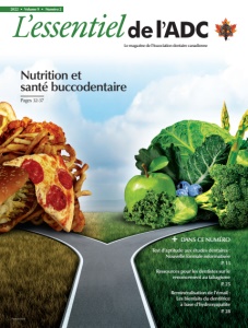 Lemagazine de l’Association dentaire canadienne PM40064661 2022 • Volume 9 • Numéro 2 Nutrition et santé buccodentaire + DANS CE NUMÉRO Test d’aptitude aux études dentaires : Nouvelle formule informatisée P. 13 Ressources pour les dentistes sur le renoncement au tabagisme P. 25 Reminéralisation de l’émail : Les bienfaits du dentifrice à base d’hydroxyapatite P. 28 Pages 32-37