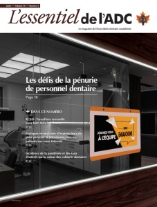 assistantes dentaires et les hygiénistes de demain», soutient Costa Papadopoulos. L’ADC travaille étroitement avec l’Association canadienne des assistant·e·s dentaires depuis plusieurs années et s’est associée à cet organisme pour soumettre un projet à Emploi et Développement social Canada dans le cadre du Programme de solutions pour la main-d’œuvre sectorielle. «Ce programme est conçu pour aborder les nombreux facteurs qui jouent sur l’attrition des assistantes dentaires en permettant d’offrir une formation en santé mentale et en bien-être au personnel des cabinets dentaires et sur les ressources humaines en santé aux dentistes et aux directions de cabinet, d’augmenter les inscriptions aux programmes de formation en assistance dentaire certifiée grâce à l’élaboration d’un programme d’études en ligne, ainsi que d’élaborer des plans d’action pour aborder la mobilité interprovinciale des travailleurs et faciliter l’intégration des nouveaux arrivants au sein des effectifs dentaires, explique Costa Papadopoulos. La population active au Canada connaît une transformation à grande échelle, ce qui se fait sentir dans tous les secteurs de l’économie. Il nous faut donc nous associer à d’autres entités, surtout du secteur des soins de santé, pour veiller à pouvoir offrir des soins optimaux à un nombre croissant de personnes au Canada.» Écoutez le balado avec Costa Papadopoulos au sujet du personnel dentaire sur CDA Oasis [en anglais] : bit.ly/3pz7nEz  10 % sont actuellement sans emploi en raison d’une maladie ou d’un trouble de santé mentale.  31 % ont déclaré qu’il manque souvent de personnel pour accomplir le travail.  53 % ont déclaré avoir trop de travail pour arriver à bien accomplir toutes les tâches qui leur sont assignées.  28 % ont déclaré éprouver de l’insatisfaction par rapport à leur emploi actuel.  25 % ont déclaré être susceptibles de se lancer dans la recherche d’un nouvel emploi au cours des 12 prochains mois.  62 % ressentent de l’anxiété au travail tout le temps ou la plupart du temps.  17 % se sentent déprimés la plupart du temps.  Le salaire horaire effectif moyen des hygiénistes dentaires dans l’ensemble des provinces et territoires a légèrement augmenté chaque année depuis 2013.  Les titulaires d’un diplôme en hygiène dentaire déclarent des salaires moyens supérieurs.  Le taux de chômage approximatif des hygiénistes dentaires est demeuré à 1 %, ce qui était inférieur au taux de chômage canadien de 6,7 % en octobre 2021.  Parmi les répondants, 94 % travaillent dans le domaine de l’hygiène dentaire clinique et 75 % travaillent pour un seul employeur.  Plus des trois quarts (86 %) des hygiénistes dentaires bénéficient d’avantages sociaux.  Parmi les répondants, 88 % ont un pouvoir décisionnel sur la mise en œuvre des services d’hygiène dentaire.  Les répondants dans des cabinets spécialisés travaillent le plus souvent en parodontie (44 %) et en orthodontie (31 %).  Les hygiénistes dentaires exerçant à titre indépendant continuent de déclarer un niveau de satisfaction élevé.  Parmi les répondants travaillant dans une clinique, 14 % sont à l’emploi d’une société dentaire. Sondage de 2019 de l’Association canadienne des assistant·e·s dentaires sur le travail et le bien-être mental : Sondage de 2021 de l’Association canadienne des hygiénistes dentaires sur le marché du travail et de l’emploi : Il faut non seulement retenir les personnes qui travaillent actuellement dans les cabinets, mais il faut aussi s’assurer de former assez de personnes pour devenir les assistantes dentaires et les hygiénistes de demain. 22 | 2023 | Numéro 5