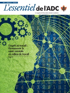 Pour plus d’informations sur le cours L’esprit au travail, visitez : oasisdiscussions.ca/the-working-mind Dans un bref témoignage vidéo présenté sur le site Oasis de l’ADC (oasisdiscussions.ca/the-working-mind), des dentistes ayant participé au cours L’esprit au travail partagent leurs réflexions et leurs expériences, en particulier le Dr Daniel Violette, d’Edmundston, au Nouveau-Brunswick. sont des membres corporatifs de l’ADC, ainsi que d’autres organisations et sociétés, peuvent maintenant parrainer les dentistes et leurs équipes pour organiser et suivre le programme L’esprit au travail. Les trois modules destinés aux équipes complètes couvrent les sujets suivants : sensibilisation à la santé mentale, réduction de la stigmatisation, encouragement des conversations sur la santé mentale, renforcement de la résilience et aide à l’autonomie. Le quatrième module, réservé aux dentistes ou aux gestionnaires, offre des conseils pratiques sur la manière de soutenir la santé mentale et le bien-être de votre équipe, tout en veillant à ce que l’environnement de travail soit respectueux et inclusif. Si nécessaire, il permet d’encourager les personnes à rechercher de l’aide pour leurs problèmes de santé mentale. « Ce cours permet aux collègues et aux gestionnaires, dans le cadre de la santé buccodentaire, d’apprendre à reconnaître les signes subtils que peuvent présenter les problèmes de santé mentale », explique M. Valentine. Notre objectif est de contribuer à créer des milieux de travail où tous les employés se sentent non seulement soutenus dans leur bien-être, mais aussi encouragés à chercher de l’aide pour tout problème de santé mentale qu’ils pourraient rencontrer. » À propos de la Commission de la santé mentale du Canada : La Commission de la santé mentale du Canada (CSMC) est un organisme sans but lucratif, créé pour porter l’attention nationale sur les problèmes de santé mentale. Son but est d’améliorer les résultats en santé mentale de tous les habitants du Canada. Changer les mentalités est une entreprise à vocation sociale de la CSMC qui offre des programmes de formation visant à promouvoir la santé mentale, le bien-être et la résilience, et à éliminer la stigmatisation dans le monde entier. 10 | 2023 | Numéro 6
