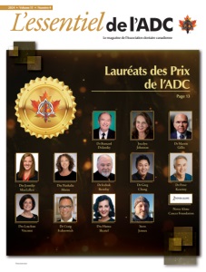 Lauréats des distinctions de l’ADC (rangée arrière, de gauche à droite) : Dr Greg Chang; Dr Craig Fedorowich; Dre LouAnn Visconti; Dre Heather Carr; Steve Jennex; Dr Martin Gillis. (Rangée avant, de gauche à droite) : Michael Scheffer; Dre Nathalie Morin; Dre Huma Sharief; Dre Jennifer MacLellan; Jocelyn Johnston; Dr Bernard Dolansky; Dr Peter Kearney. Absent : Dr Izchak Barzilay. Lauréats des prix de l’ADC Distinction pour la promotion de la santé buccodentaire Cette distinction est décernée à des personnes ou à des organismes qui ont contribué à améliorer la santé buccodentaire de la population canadienne grâce à des efforts de promotion de la santé buccodentaire, ce qui peut comprendre l’élaboration de politiques de santé publique, la création demilieux favorables, le renforcement de l’action communautaire, le perfectionnement de compétences personnelles et la prévention de maladies et affections buccodentaires. Never Alone Cancer Foundation La Never Alone Cancer Foundation a travaillé étroitement avec l’Association dentaire du Manitoba (ADM) pour établir un programme de dépistage du cancer de la bouche dans la province. Grâce à cette initiative d’une journée, quelque 120 personnes en moyenne bénéficient d’un examen de dépistage gratuit. Environ 10 % d’entre elles sont orientées immédiatement vers un spécialiste. Les bénévoles de la Fondation assurent le soutien et la coordination de ce programme, et l’ADM veille à recruter les dentistes, les assistantes, les hygiénistes et le personnel bénévoles pour le faire fonctionner. Ce programme fait partie intégrante de la mission de l’ADM en proposant des dépistages gratuits du cancer de la bouche à la collectivité. Il constitue une initiative clé de l’ADM accessible au public. J’ai l’honneur d’accepter ce prix au nom de la Fondation et de notre formidable équipe. Notre collaboration avec l’ADM est un exemple éclatant de tout ce que peut réussir à faire un partenariat pour concrétiser des initiatives en matière de santé buccodentaire. Ensemble, nous avons fait de la sensibilisation au cancer de la bouche. Notre initiative a touché la vie d’innombrables personnes et a mis en valeur le rôle essentiel des soins buccodentaires. La Fondation est heureuse de cette reconnaissance, qui nous motive à poursuivre notre mission de soutien, de sensibilisation et de contribution au bien-être des personnes touchées par le cancer. ~Michael Scheffer, directeur général, Never Alone Cancer Foundation 20 | 2024 | Numéro 4